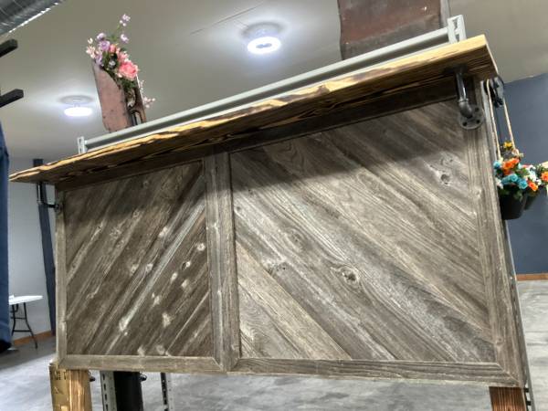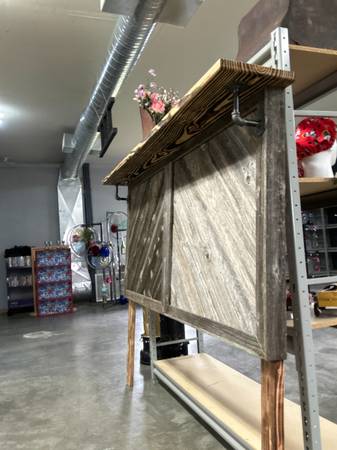 Also have a Barnwood headboard that fits King or Queen size beds. Has a burnt 2x10 shelf on top and cast iron pipes on the sides for decoration purposes. ($200).