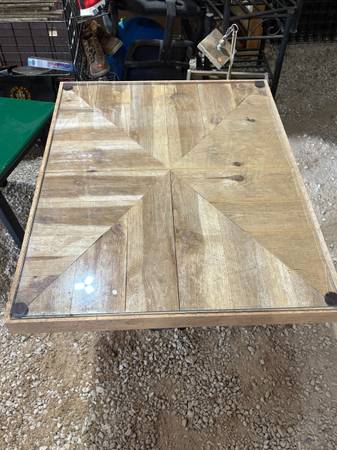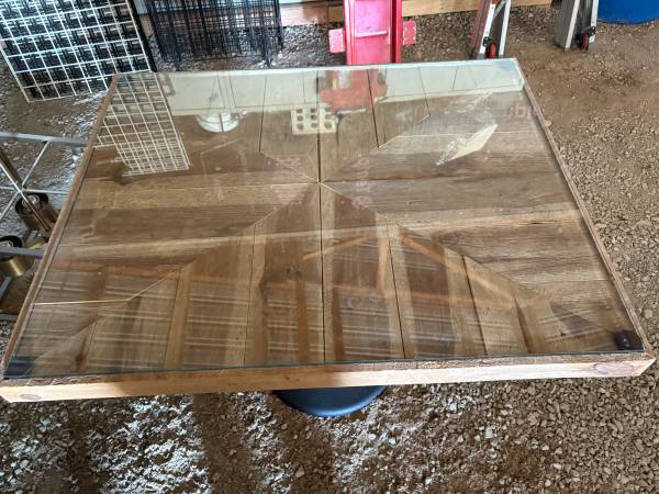 Third table is a little bigger than the others, still made of barnwood and has the 2x4 legs that have been burnt and sealed. The top glass is smoked and has an opening in the center for electrical cord or whatever else you may use it for.