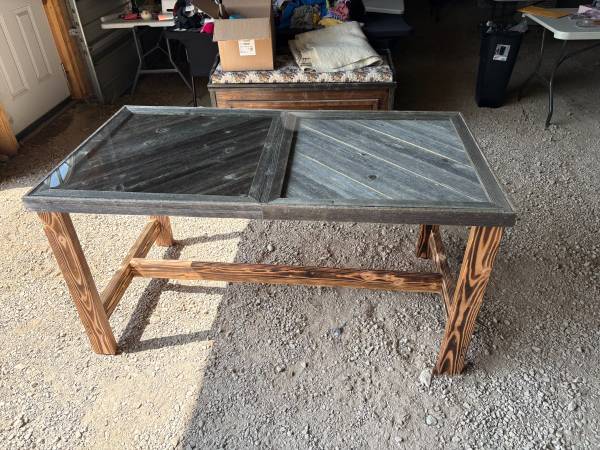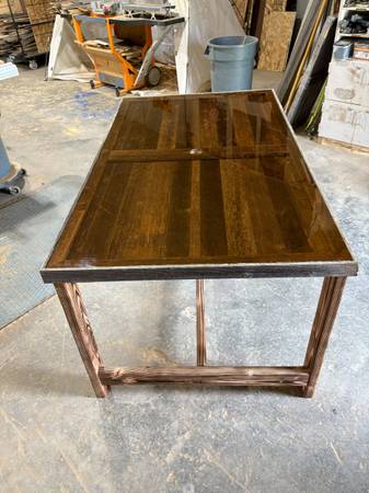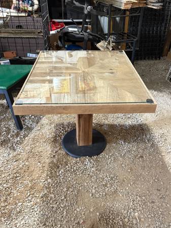 Second is a regular barnwood table with a clear glass on top. Legs are made of 2x4's that were burnt and sealed. You can ad pictures or small knick knacks under the glass.