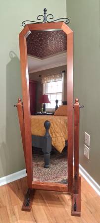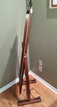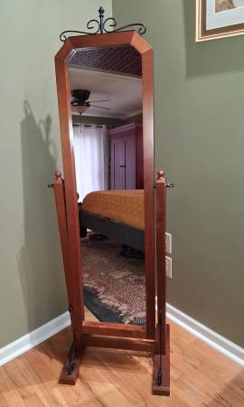 Unique adjustable floor mirror. Solid wood with black metal accents. Great in dressing area or walk-in closet. Good condition; mirror is clear with no defects, framework operational and stable. Cash...
