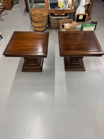 $69.00 - Offering a pair vintage wood pedestal end tables in really good condition [see pictures] - each table is solid wood & measures [20" x 20" x 17" tall] - asking only [$69.00] for pair, a bargain