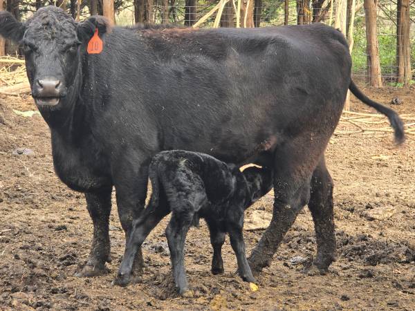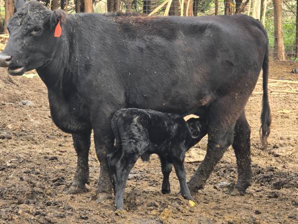 2nd calf heifer (her second calf) with bull calf. Gentle pair. Calf is 3 weeks old. I can band him if you want him to be a steer. The heifer has good bag, good feet. Possible delivery. $3900 cash...