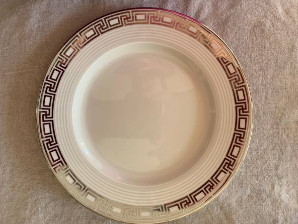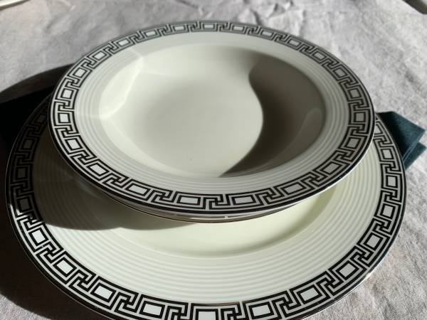 The pattern is ivory with a silver Greek "meander" (also known as "key") pattern on the rim. Note the design is silver, not black as it may appear in some photos. Most pieces are unused. Service for...