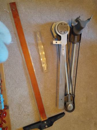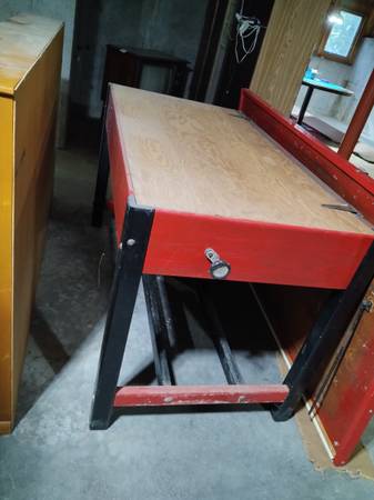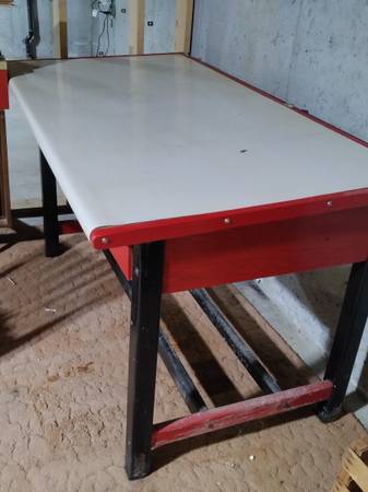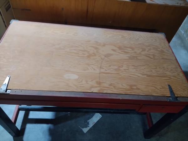 Large table was used as a drafting table. The base has hinges to hook to the top and there is a knob on the side to raise/lower the back of the top. The top is not currently attached to the base. Has two drawers in front. The drafting arm comes with it. The top is in good condition.