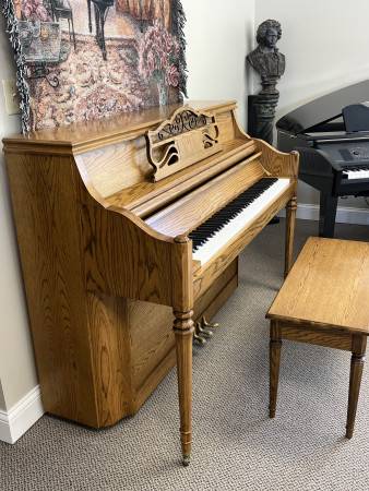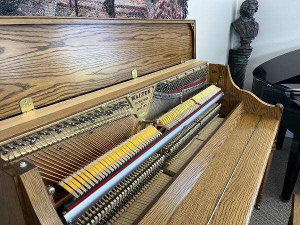 Built in 1991 in Elkhart, Indiana by the Walter family, this instrument is among the finest pianos built today. It features heavy-duty reinforced hammers, a solid spruce soundboard, a duet bench, a finely detailed oak cabinet, and a beautiful sound! The select wood grain of the oak makes this special piece of furniture even more attractive!