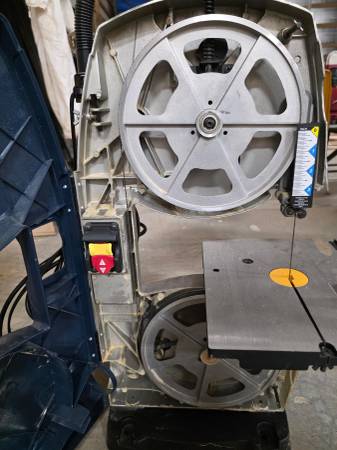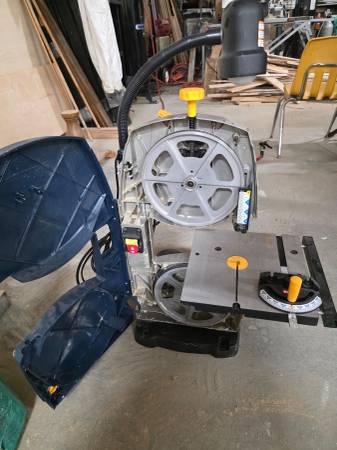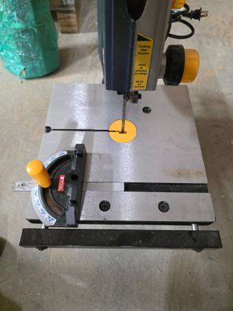 The Ryobi BS903 is a compact 9‑inch (229 mm) band‑saw designed for hobby‑shop and light‑duty woodworking. Accepts 59-1/4" band‑saw blades. Red “on” switch with a removable key, blade guard covers, and a built‑in overload protection circuit. The unit has been kept in good shape, with no missing parts, a clean blade path, functional motor and switches, and the original miter gauge. This is a well‑maintained Ryobi BS903 that offers reliable performance for small woodworking projects, ideal for hobbyists or anyone needing a portable, affordable band saw.