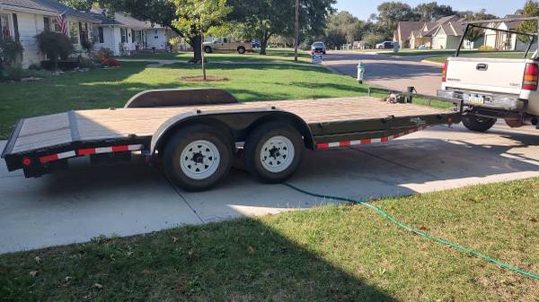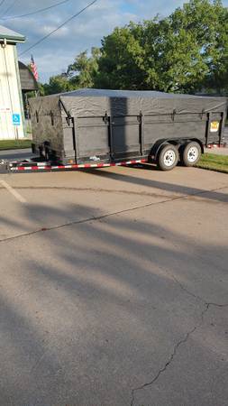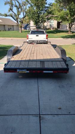 This trailer has always been stored inside. Wood floor good shape. Has a 12 volt winch, 3000lb. Has 4' custom, wood enclosure and custom fit, heavy duty tarp secured by 1" heavy duty straps with metal cinch buckles. Is easy to remove and store wood enclosure. Is 10,000 lb. GW. rated. Has less than 500 miles on new tires. Less than 8,000 miles on trailer, used for local use. Bought trailer new. Also has a spare tire. Has heavy duty ramps for the back stored under trailer in lockable slides.
