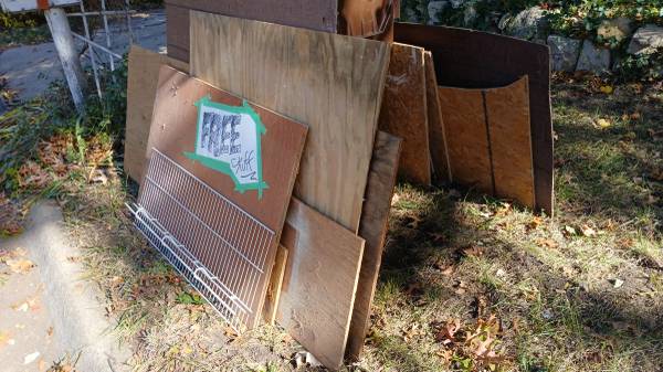 Leftover material from various projects free on the curb. Other stuff as well. (Don't take the compost bin)